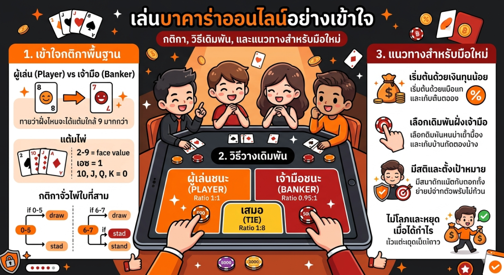 บทความนี้จะพาคุณไปทำความรู้จักกับบาคาร่าออนไลน์ตั้งแต่พื้นฐาน วิธีเล่น กติกา ไปจนถึงแนวคิดสำหรับผู้เล่นมือใหม่ที่ต้องการเริ่มต้นเล่นบาคาร่าอย่างเข้าใจ